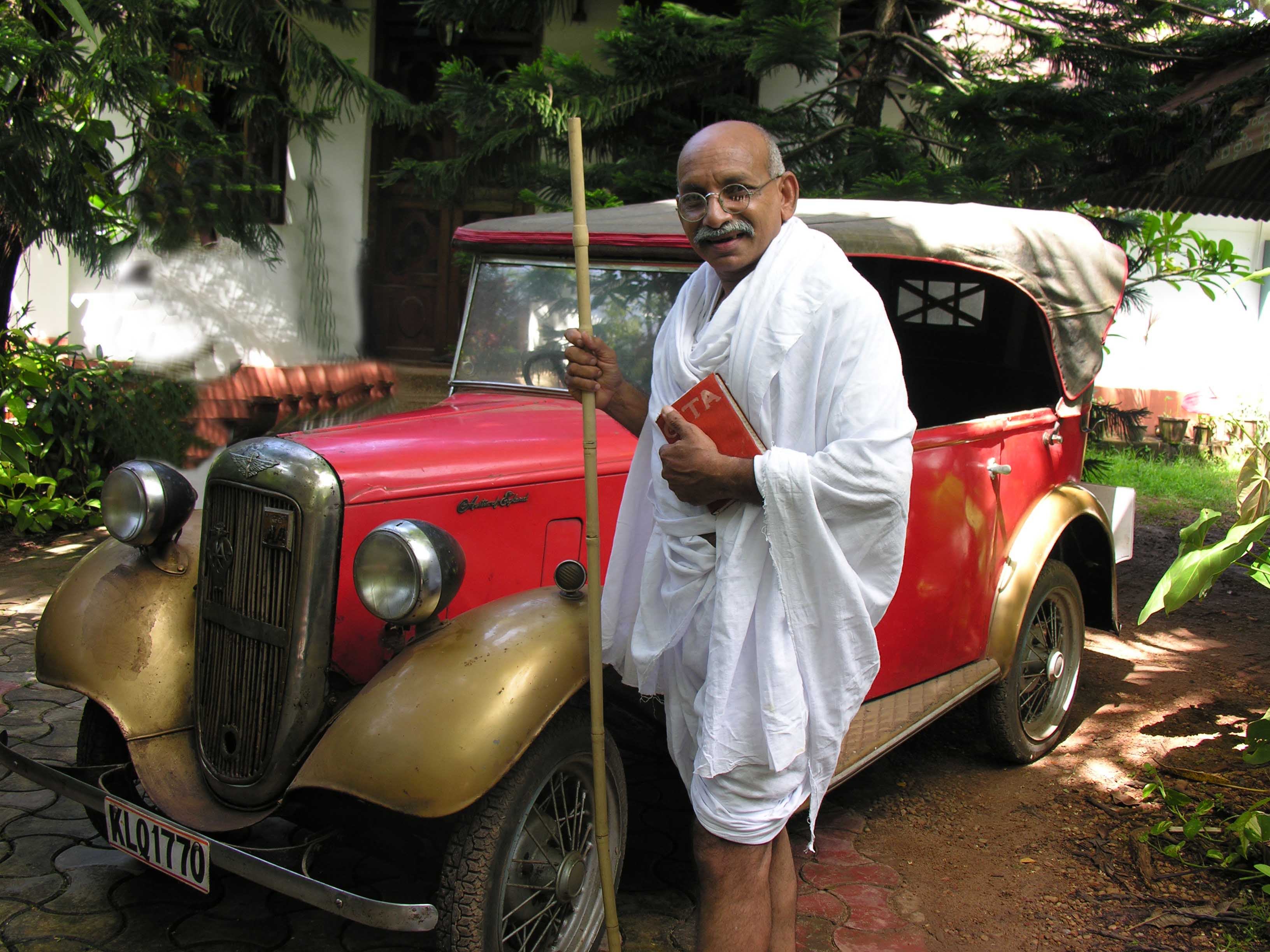 “I first dressed up as Gandhi in 1985, April 24 for a fancy-dress competition held in our company. A few of my colleagues in the Punnapra Scooters company, Alleppey, suggested that my face will suit Gandhi‘s role perfectly. Sreekantan, one of my friends who used to act in plays painstakingly did the make-up. Once done, from the admiring glances of the onlookers I instantly knew, it was a success,” says George. People stood up from their seats the moment he entered the arena and greeted him with starstruck gestures.